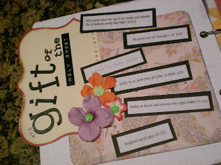 This is an album that I made Brekyn for her baptism. I got the idea from a post on 2 peas and rolled from there. It was so fun making this. I put a place in it where people could sign it so she could remember who was there. There is even a place for her to put her cards and special notes from people. She wrote down her feelings and we sealed them in an envelope for her to open when she gets older. Now I have to get the pictures in place. She absolutely loves this book.
